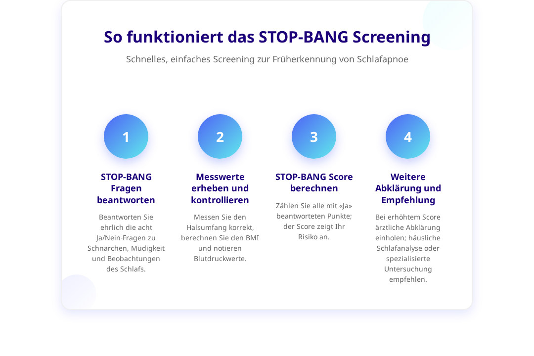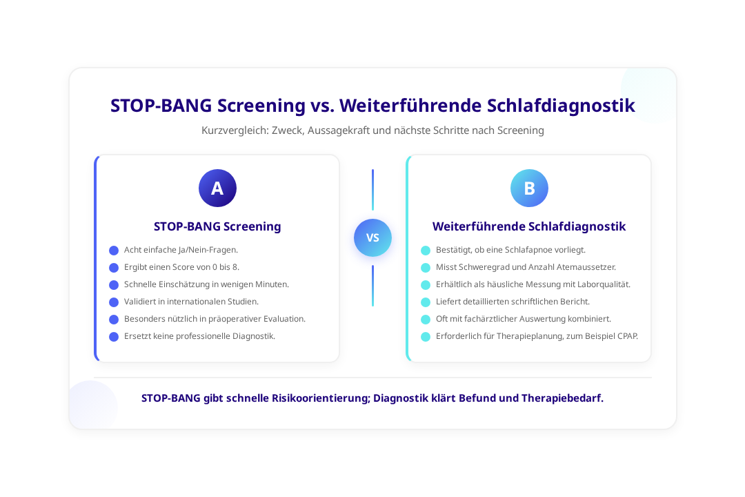 Wichtig zu verstehen ist, dass der STOP-BANG Score ein Screening-Tool ist, keine Diagnose. Ein hoher Score bedeutet erhöhtes Risiko, aber nicht automatisch das Vorliegen einer Schlafapnoe. Umgekehrt schliesst ein niedriger Score eine Schlafapnoe nicht vollständig aus, insbesondere bei Frauen oder jüngeren Personen.