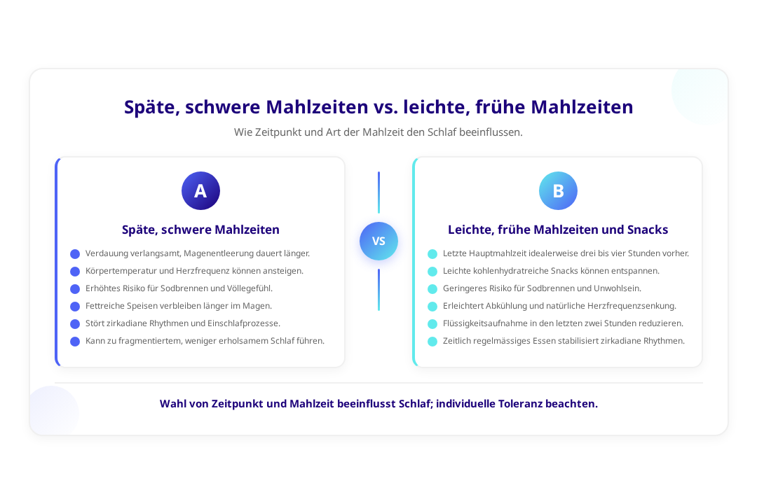 Der Zeitpunkt der letzten Hauptmahlzeit spielt eine entscheidende Rolle.[6] Idealerweise sollte diese mindestens 3-4 Stunden vor dem Schlafengehen erfolgen. Dies gibt dem Körper ausreichend Zeit, die schwere Verdauungsarbeit zu bewältigen, bevor die Schlafphase beginnt.