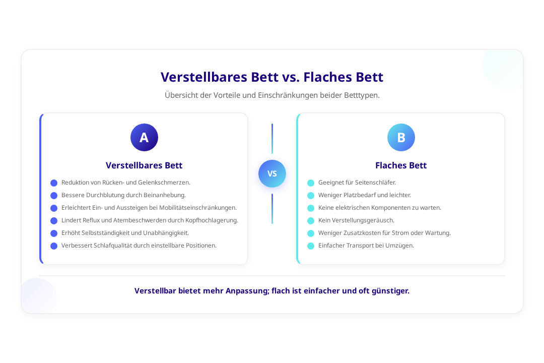 „Verstellbare Betten sind nicht nur ein Komfortfeature, sondern können bei richtiger Anwendung therapeutische Wirkung haben. Die Möglichkeit, Kopf- und Fussteil individuell zu positionieren, kann bei verschiedenen gesundheitlichen Problemen wie Reflux, Durchblutungsstörungen oder Rückenschmerzen deutliche Linderung bringen.“
