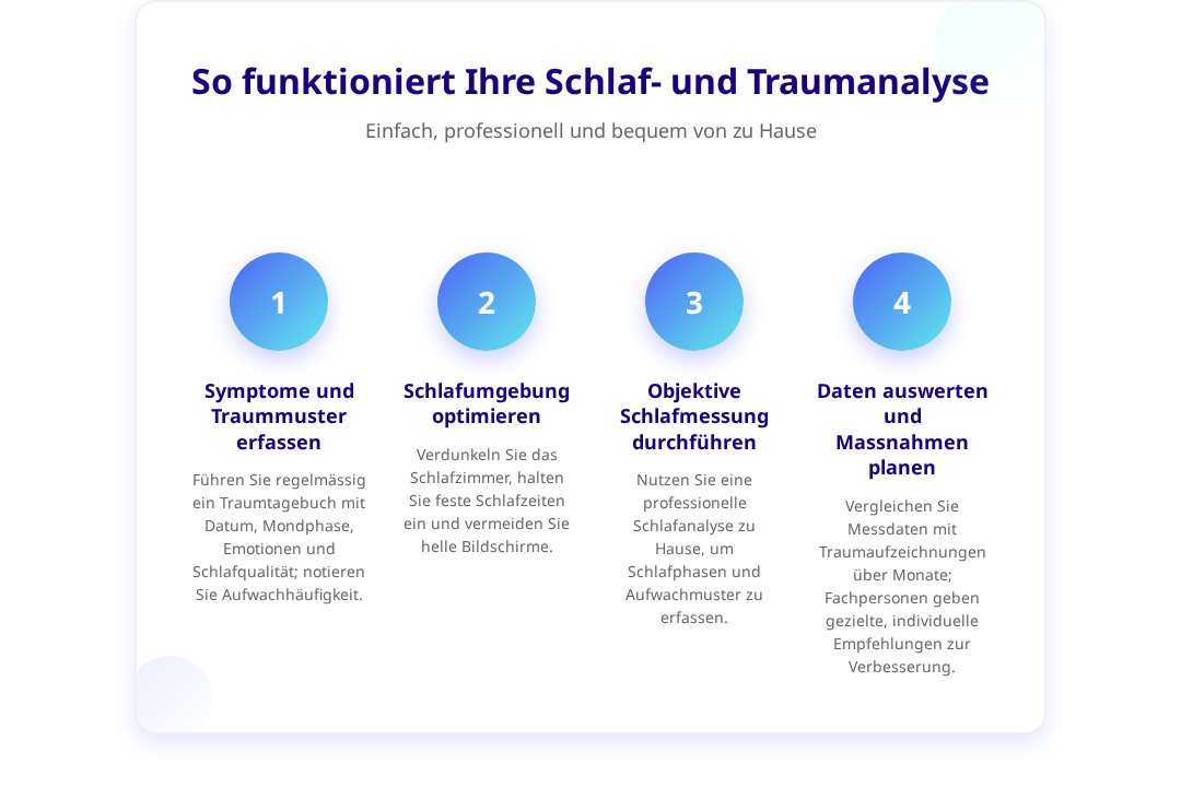 Besonders hilfreich ist unser Service für Menschen, die ihre Träume systematisch verstehen möchten. Durch die Kombination aus Schlafmessung zu Hause und fachärztlicher Auswertung erhalten Sie ein umfassendes Bild Ihrer nächtlichen Aktivität – eine solide Grundlage für jede seriöse Traumdeutung.