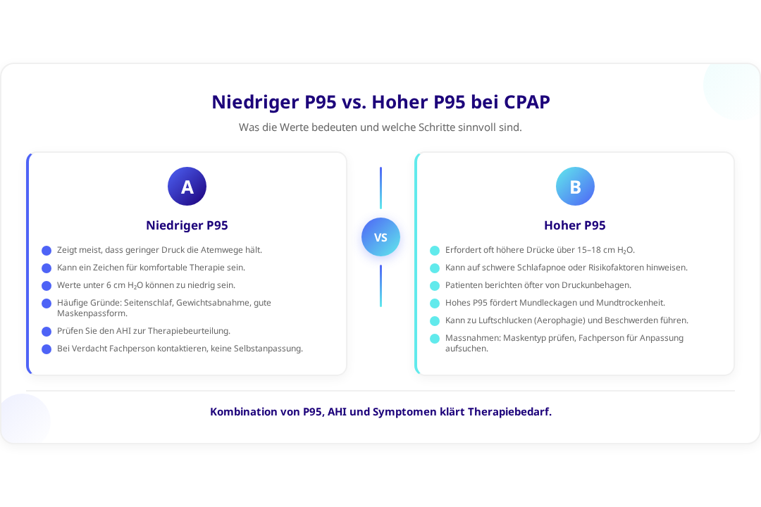 Besonders niedrige P95-Werte unter 6 cm H₂O können darauf hinweisen, dass Ihr Therapiedruck möglicherweise zu niedrig eingestellt ist. In diesem Fall sollten Sie prüfen, ob Ihr AHI-Wert (Apnoe-Hypopnoe-Index) noch im therapeutischen Bereich liegt. Ein AHI unter 5 Ereignissen pro Stunde ist das Ziel einer erfolgreichen CPAP-Therapie, idealerweise sogar unter 1[2].