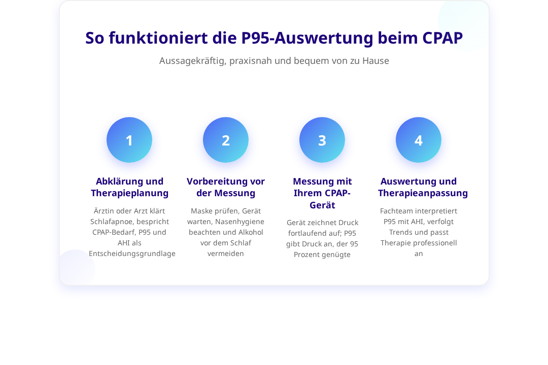 Falls Ihre P95-Werte auf Optimierungsbedarf hinweisen, begleiten wir Sie bei notwendigen Anpassungen. Dies kann von einfachen Maskenanpassungen bis hin zu komplexeren Einstellungsänderungen reichen. Unser Ziel ist es, Ihnen zu einer CPAP-Therapie zu verhelfen, die sowohl effektiv als auch komfortabel ist – für langfristigen Therapieerfolg und bessere Lebensqualität.