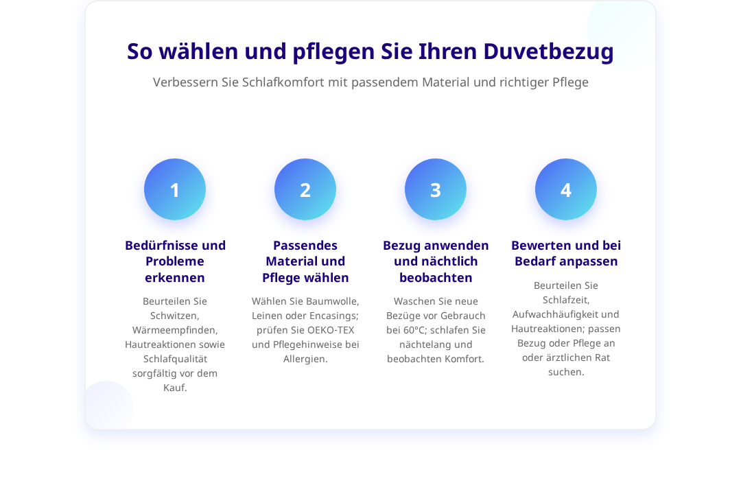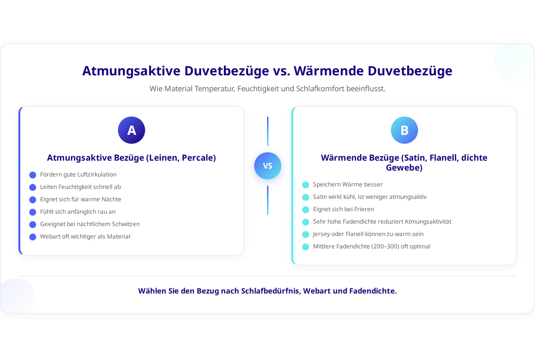 Die Wahl des richtigen Duvetbezugs sollte auf die persönlichen Schlafgewohnheiten und gesundheitlichen Bedürfnisse abgestimmt werden. Menschen, die nachts stark schwitzen, profitieren von atmungsaktiven Materialien wie Leinen oder lockeren Baumwollgeweben. Wer schnell friert, ist mit dichteren Geweben oder Flanell besser beraten.[3]