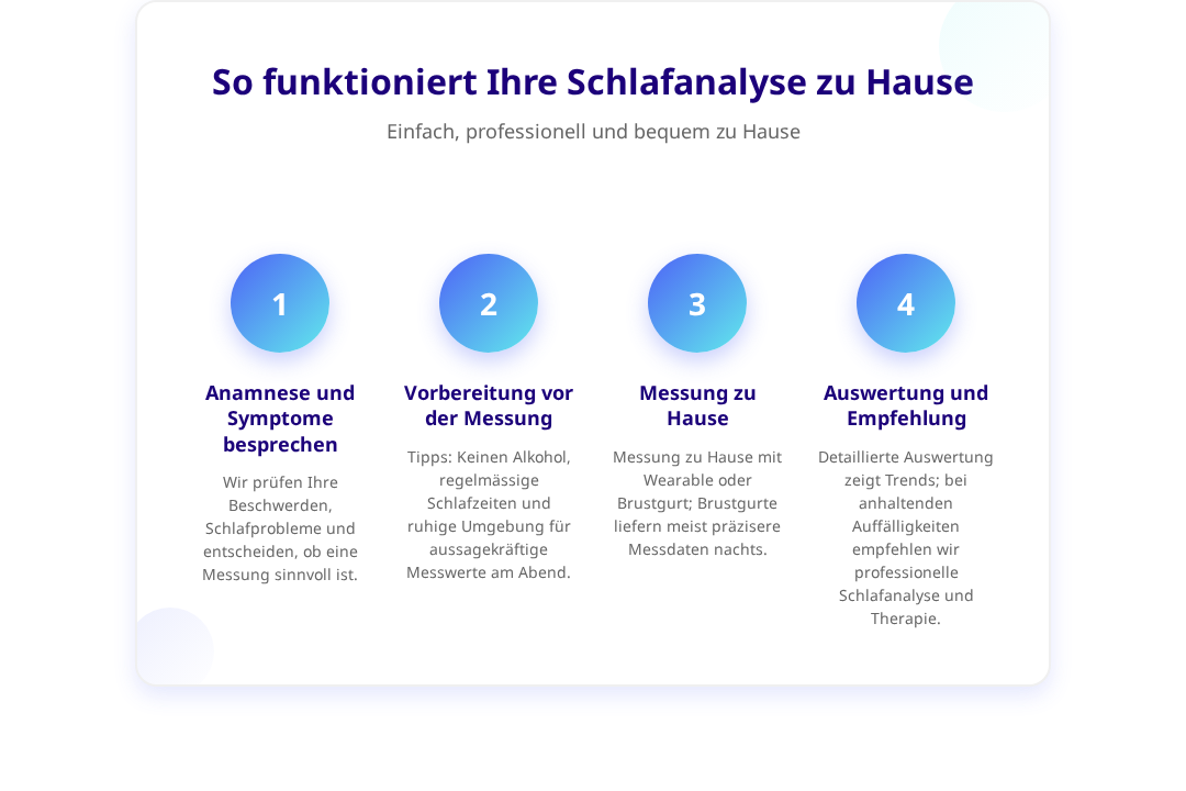 Bei auffälligen HRV-Mustern oder anderen Schlafproblemen können Sie einen Termin für eine umfassende Schlafanalyse vereinbaren. Die Untersuchung erfolgt in der gewohnten Umgebung, was natürlichere und aussagekräftigere Ergebnisse ermöglicht als herkömmliche Schlaflabor-Untersuchungen.
