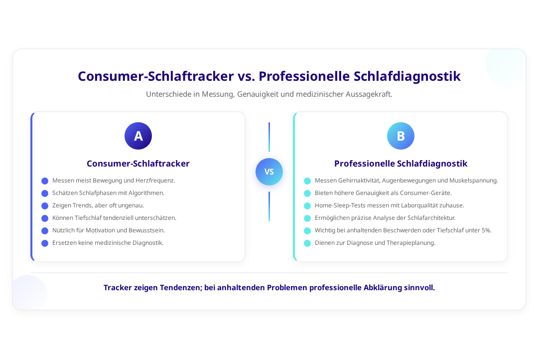 Consumer-Geräte haben oft begrenzte Genauigkeit und können Tiefschlaf unterschätzen. Sie messen meist nur Bewegung und Herzfrequenz, was für präzise Schlafphasen-Bestimmung nicht ausreicht. Professionelle Schlafstudien verwenden Gehirnstrommessungen für genauere Ergebnisse.