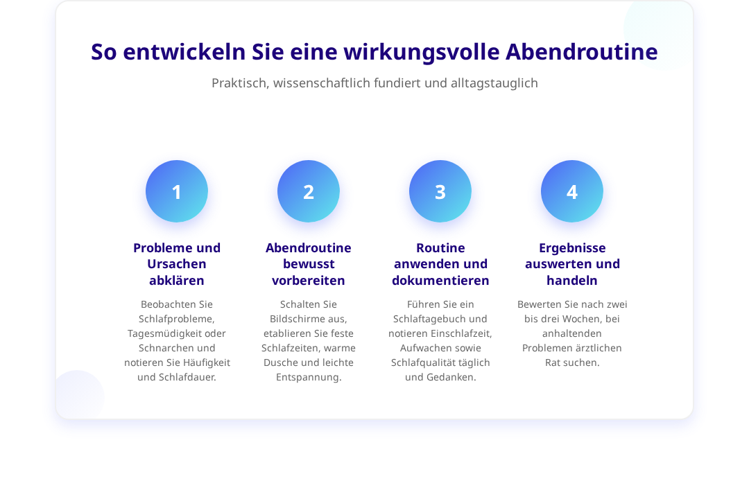 In der Regel benötigt der Körper 2-3 Wochen, um sich an eine neue Abendroutine zu gewöhnen. Erste Verbesserungen können jedoch bereits nach wenigen Tagen spürbar werden. Wichtig ist die konsequente Einhaltung der neuen Gewohnheiten.