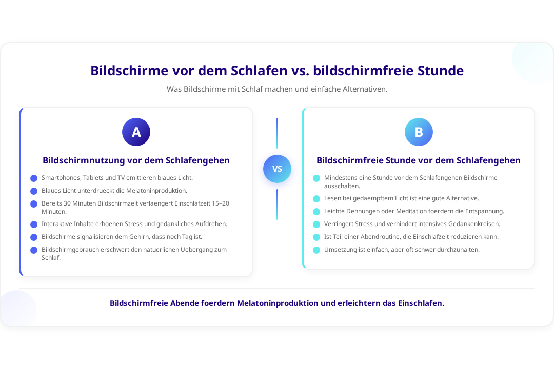 Eine der häufigsten Ursachen für Einschlafprobleme in der heutigen Zeit ist die Nutzung von Bildschirmen vor dem Schlafengehen. Smartphones, Tablets, Computer und Fernsehgeräte emittieren blaues Licht, das unserem Gehirn signalisiert, dass es noch Tag ist. Dies unterdrückt die natürliche Melatonin-Produktion und hält uns wach.[3]