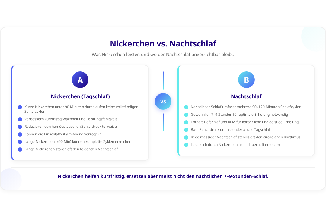 Ein langes Nickerchen kann kurzfristig helfen und erreicht tatsächlich einen vollständigen Schlafzyklus. Es ersetzt jedoch nicht die komplexe Schlafarchitektur einer ganzen Nacht mit mehreren Zyklen. Zudem kann es den folgenden Nachtschlaf erheblich beeinträchtigen.