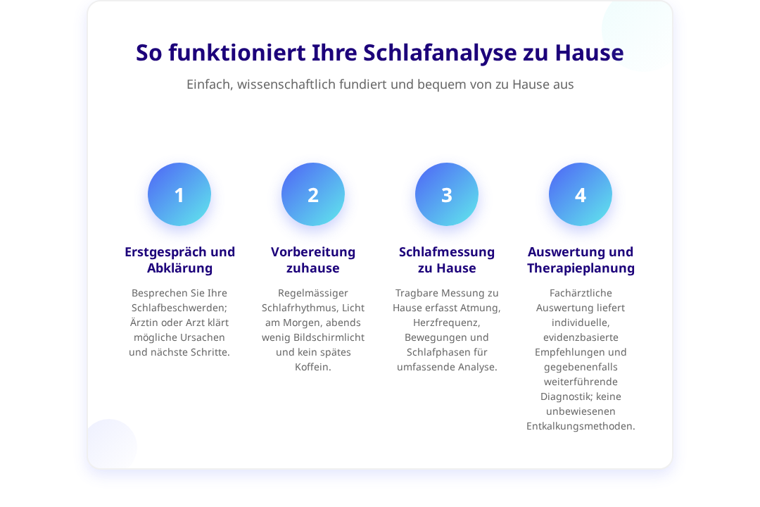 Bei Sleep Lab verstehen wir, dass Schlafprobleme verschiedene Ursachen haben können. Anstatt auf unbewiesene Methoden zu setzen, bieten wir Ihnen eine wissenschaftlich fundierte Schlafdiagnostik, die Sie bequem zu Hause durchführen können. Unsere Analyse erfasst die wichtigsten Schlafparameter und gibt Ihnen konkrete Hinweise auf mögliche Störfaktoren.