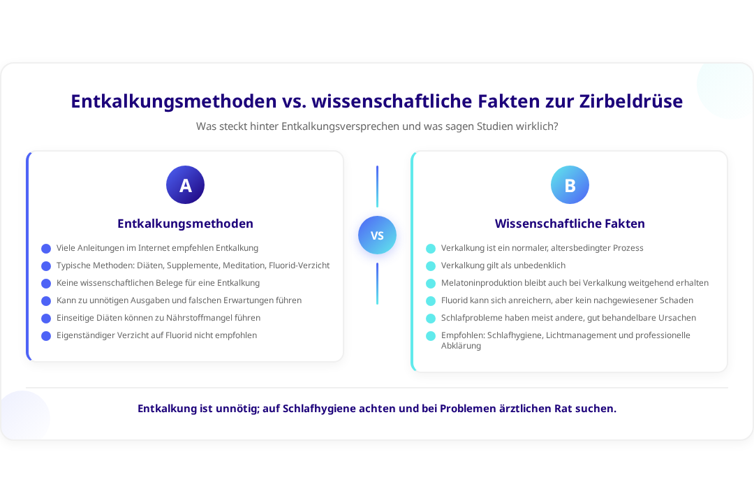 Statt auf unbewiesene Entkalkungsmethoden zu setzen, sollten Betroffene zunächst die Grundlagen der Schlafhygiene überprüfen und bei anhaltenden Problemen professionelle Hilfe suchen. Oft lassen sich Schlafstörungen mit einfachen, aber wirksamen Massnahmen deutlich verbessern.