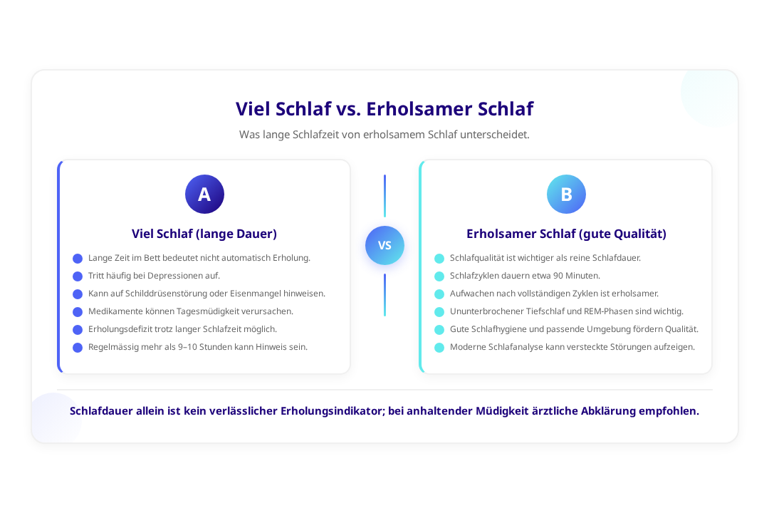 Lange Schlafdauer garantiert nicht automatisch erholsamen Schlaf. Häufige Ursachen sind gestörte Schlafzyklen durch ungünstiges Aufwachen, Schlafapnoe oder psychische Faktoren wie Depression. Auch medizinische Ursachen wie Schilddrüsenstörungen können trotz viel Schlaf zu Müdigkeit führen.