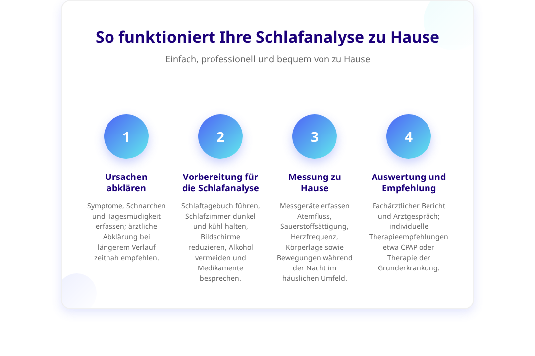 Unsere Schlafanalyse erfolgt bequem zu Hause mit Geräten in Laborqualität. Sie erhalten einen detaillierten schriftlichen Bericht, und auf Wunsch können Sie die Ergebnisse in einem 30-minütigen Online-Gespräch mit einem Facharzt besprechen. Dabei entwickeln wir gemeinsam einen individuellen Plan für besseren, erholsameren Schlaf.